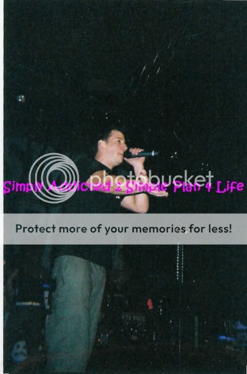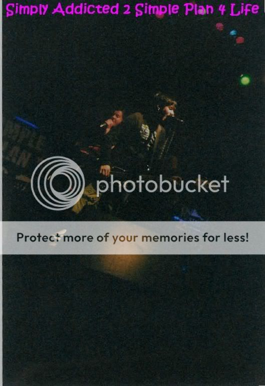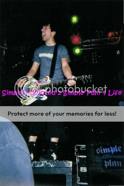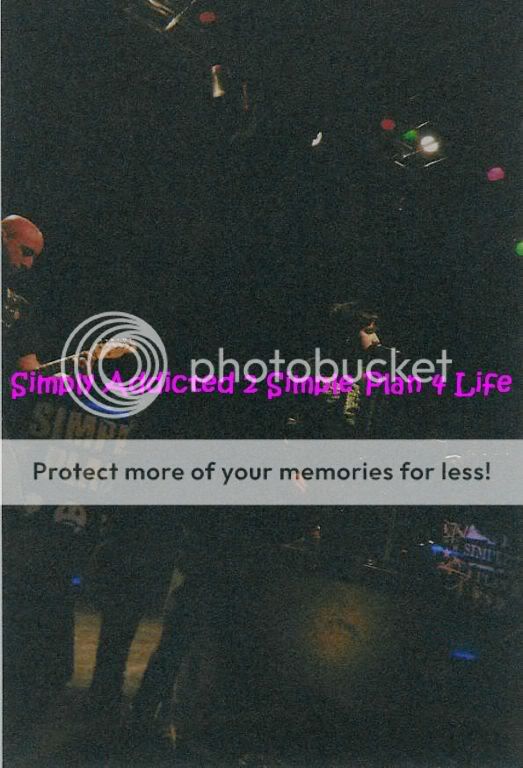Simple Plan's show on May 5th 2003 was great, although I didnt have good seats because I didn't buy tickets at first because all they announced was that it was Avril Lavignes tour, and when they announced that Simple Plan was opening the GA floor was sold out, but that actually worked out for the best. The section I was sitting in was the last one off to the side of the stage, and there was a open door there. I wanted to go back there but the security guard told me I couldn't. I asked him what it was and from that door you could go backstage or out to the bus area. So me and my friend Sarah waited out around the door just to see if we could see anyone. we didn't want to sit in our seats waiting for the show to start. Tom from GOB walked by, and then we saw Patrick come out. I had already met Pat before but my friend hadn't and she was too shy to talk to him so I ended up calling his name and taking a picture with him and he gave me some gummie bears and then had to go check on the merch. Then we saw Seb run by and yelled his name, he didn't come out but he kept stopping in front of the door and messing with us. Then we were talking and not looking and Pierre came by and stopped and stared at us I called his name and waved, he waved back and then ran off. Soon after the show started. When Simple Plan came on the crowd was good. They sang the songs they normally played and also did little covers of Ice Ice Baby, In Da Club and other songs. They put on a hell of a show and then we went to the signing. I saw Pat and my friend Kelley was talking to him and I went over and we all talked about the DVD and about the Invasion Crew. We got back in line and went through and met the guys. Got pictures with some of them. Then went to watch Avril. After the show we met up with my sister who had GA seats and then were about to leave when one of our friends moved a gate and we drove to the bus area and waited around for the guys, we talked to David for about 10 minutes and then Chuck came out, I didnt have anymore pictures left and so I just asked him for a hug, he though I asked for a picture so he put his arm around me and was like "Sure who's going to take it?" and I told him "I just wanted a hug" he was like oh ok then and hugged me really tight and for a long time. Then we went to talk to Jeff and he showed us his tattoo, and then we had to leave.