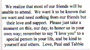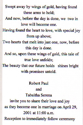 For those people that we weren't able to contact, here is a copy of the invitation (Made on a computer program bought for $20 at WalMart!!). The poem is part of one I wrote for our day.