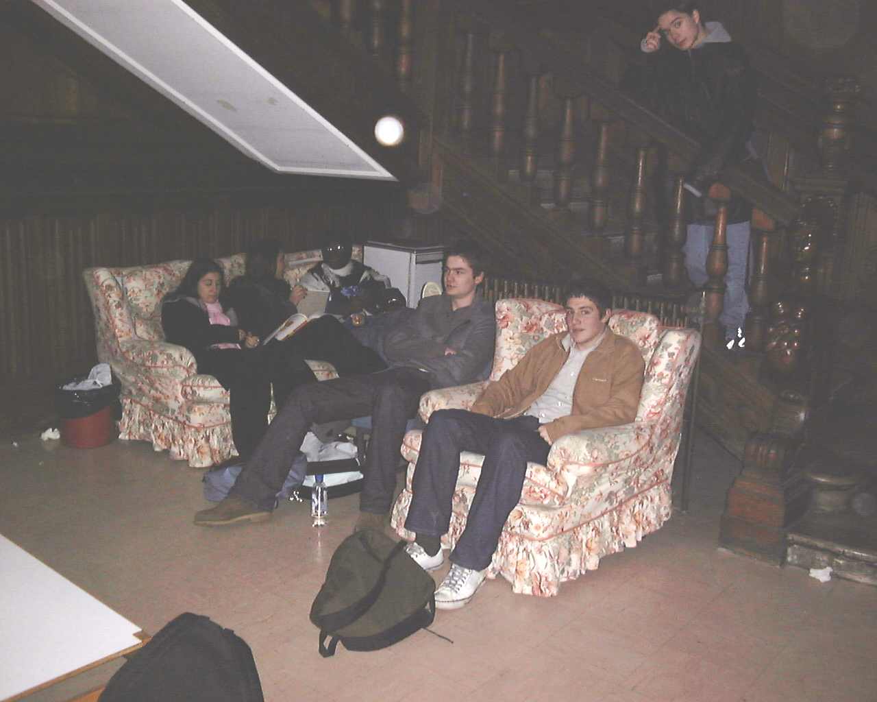 Behold the common room in all its glory Left Sofa: Alfred + 2 premieres Centre: Patrick Right: Oli G Stairs: Eric Is it even a common room? Maintenance staff and laundry persons are constantly walking through. Not to mention a glaring Mr Simon looking on from above accompanied by the odd 'surveillant' telling us to shutup, we're supposed to be able to at least talk in our frickin' common room. I mean, it's more like an inadequately ventilated, poorly lit, feebly heated space next to the stairs with a few old and dirty chairs and sofas thrown in that the homeless refused to accept. |