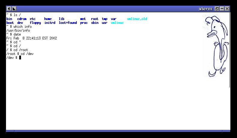 The Duck's name is Dexter and through this character the fear of UNIX commands will be lost. Everyone will smile when they see Dexter on t-shirts and on television because they are familiar with him in their lives. With special window manager technology (Englightenment) programmers will insert floating graphics over the terminal. A special terminal for new users will be created called DEXTERM where he will appear and float over the window with smooth animation technology. He will be summoned by certain keywords or if you need help. I have developed an example that programmers from I.B.M. and Linux can follow: