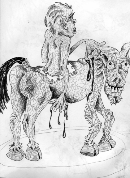 seen a full Nuckleavee and lived to tell the tale. From the few recorded decriptions of Nuckelavee's we know that his head is described as being much akin to a mans only "ten times larger" with an incredibly wide mouth that jutted out like that of a pig. He is hairless and has no skin so that the entire surface of the monster's body appears like raw and living flesh, from which the skin has been flayed. It is said that thick, black blood can be seen coursing through his veins and his sinewy muscles writhe with every movement made. Nuckleavees were once men who went through a horrifying transformation. No one can explain how the transformation comes about, but it starts with the victims head becoming loose upon his neck, and swelling larger than normal. Choking noises are often made by the victim. The head begins to move around by itself, seemingly without the victim’s control. The only way to stop a transformation this far along is to secure the