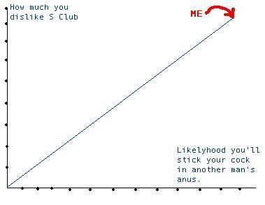 The all purpose insult. ALL people who don't like S Club are homosexual. It's a known fact, as are people who listen to those mad goths Slipknot and Sum41 and all people who have a website that happens to have views you disagree with. In fact, here is an entirely accurate graph to prove my point.
