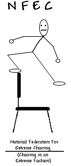 Extreme Chairing!Extreme Chairing. Words cannot begin to describe this new sport. It was invented jointly in the month of December, year of 2000, in study hall by Clay and friend of Third Rail Justin K, after one of the two fell off his chair. It was then dubbed an "extreme" thing to do, fall off a chair that is, and it was then that Extreme Chairing became a full-blown contact sport. In all aspects of Extreme Chairing, the athlete must eventually fall to the ground. The most popular chair, which is called the "rig", is the classic folding chair. It is the most versatile type and in some events the only suitable one. The events in Extreme Chairing are the Vertical Collapse, the Stunt Jumping, the Sac, the Straightover, and the Twist. The links below contain a little more info and explanation on the event and will eventually harbor some mad nice pics. Stay tuned.Pictures are on the way as soon as Sean uses his scanner or Clay hooks his up. Post any and all comments or questions on extreme chairing in the guestbook. |