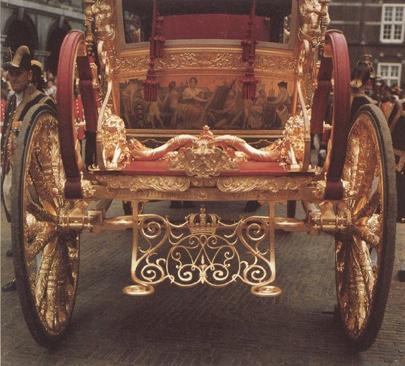 The paintings on the panels signify: Tribute by the Netherlands (right), Tribute by the colonies (left), History (rear; this includes pictures of the Royal Palace and the Nieuwe Kerk), and Future (front). The allegorical figures on top of the coach represent the four activities that are vital for prosperity: Trade, Labour, Agriculture, and Shipping. Together they carry the crown, sceptre, and sword.