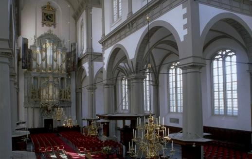 The building, in the shape of a rectangle, is 29 metres wide, 28 metres high, and has 36 windows. Two rows of triplet-pillars support a clerestory in the form of a Greek cross. The nave is covered by a wooden barrel vault, of the type used extensively in coastal regions of the low countries, where the soft soil did not allow heavy vaulting. The Dutch Calvinist Protestants strongly advocated an austere and unadorned church interior. This ideological starting point was the driving force which resulted in the well-balanced geometrical arrangement of the basic parts of the building. Hendrick de Keyser designed the church in Dutch Renaissance style, characterized by a combination of brick and stone. The long vertical lines are reminiscent of the Gothic style.