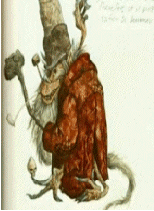 The Fir Darrig, which means "Red Man" is a faerie imminently fond of practical jokes, especially gruesome ones, and usually appears as a rather squat, very wrinkled old man in a ragged red coat and hat, long, coarse grey hair and smoking a blackthorn pipe. He is sometimes thought to have been an unlucky former human who had wandered into the fairy hills by chance, and would often try to give advice to those who were about to make the same mistake.