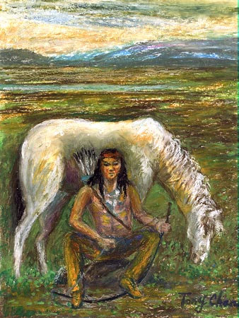 "Getting ready for the hunt"An Indian testing his bow with his horse at his side! Oil-pastel on paper 11" x 8 1/2". |