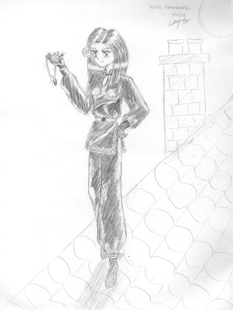 This is Kaitou Kuroibara, aka my little sis.^^ (Kuroibara=black rose.) She begged me to draw a manga style pic of her as a 'kaitou,' so I finally did.^^; It doesn't look anything like her, but she liked it, so I guess it's a success.^_^