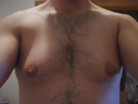 | Flexing my chest in this photo. The upper chest is fine, but look at the lower area around the areola. Again I think it's gland. | What I think is showing on the lower chest are the glands I think. I'm not sure. I hate it though. That's the camera remote control wire in the pic. | This is my left breast which is bigger than the other one and has a bigger areola. |