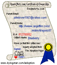 This is Blueberry,I got her from Blueberry's adopted place She is playful and enjoys playing w/ all of my other pets ^^...including the dragons!
