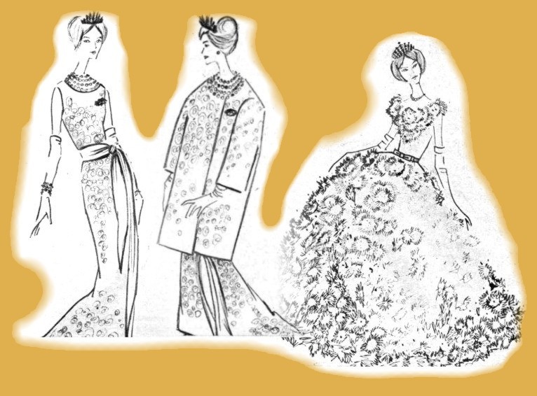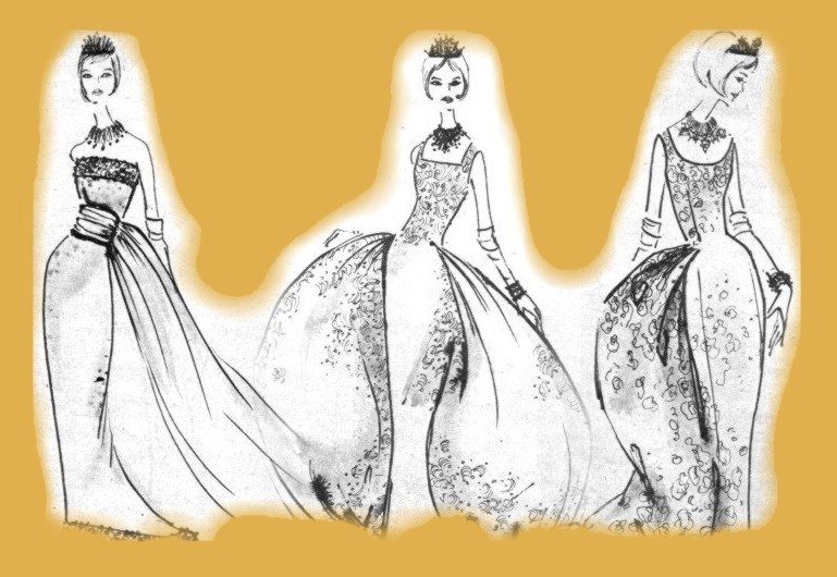 From left to right, the designs of the dresses worn by the Marchioness of Campo Real, godmother to Doņa Fabiola, the Marchioness of Vilanant and the Marchioness of Villanueva.