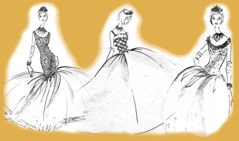 From left to right, the designs of the dresses worn by the Marchioness of Perinat, the Marchioness of Quintana and the Marchioness of Casa Valdés.