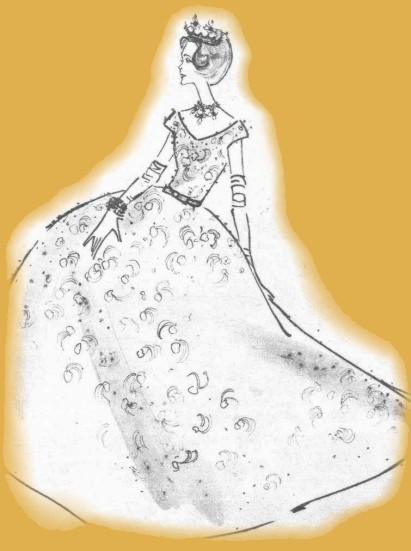 Above, Marbels design of the dress worn by Doņa Fabiola in the state banquet and gala ball in the Royal Palace of Brussels, on the 13th December 1960. A very Spanish mantilla in the same tones hanged from Doņa Fabiolas shoulders. The dress was in light yellow satin duchesse.