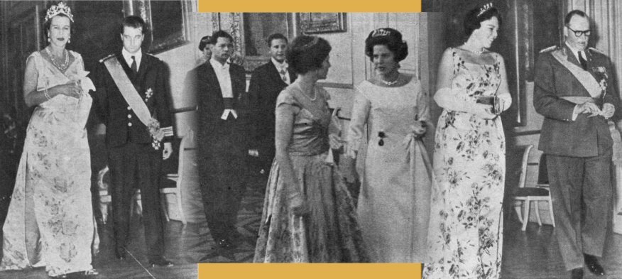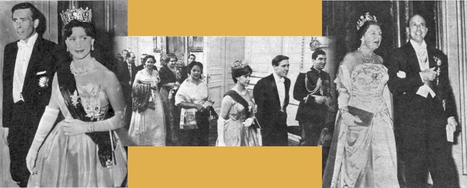 On the left, HRH Princess Margaret of the United Kingdom, Mrs. Armstrong Jones, is escorted by her husband in the Royal Palace of Brussels. It was Princess Margaret’s first representation abroad since her wedding, boycotted by most royal houses of Europe. The Princess wears the magnificent Poltimore Tiara that she wore for the first time at her wedding, earlier in 1960. The couple is seen in the middle with Prince Golam Reza of Iran, brother of the Shah. Other guests, including HRH the Duchess of Braganza, who wears an unidentified tiara, follow them. By the side of the Head of the Portuguese Royal Family’s wife, HRH the Duchess of Bavaria wears an imposing diamond and pearl tiara. Behind them it is possible to spot HIRH the Archduke Otto of Austria, Prince of Hungary, and HRH the Duke of Braganza, D. Duarte Nuno. In the picture on the right, HM King Umberto of Italy accompanies HM the Queen of the Netherlands, Juliana, who wears perhaps the most valuable and certainly the most impressive tiara of the evening, the magnificent Stuart Diamond Tiara.