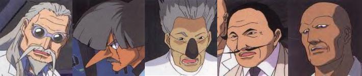 Dr. J trained Heero to be a killer and to carry out his mission NO MATTER WHAT! He was also the one who refused to give up Wing 0 to Oz, causing Heero to self-destruct and practically kill himself. He is probably known best for his goggles and mechanical hand. Professor G found Duo trying to destroy Deathscythe, originally, but gave it to him instead. He is probably best known for his mushroom-like haircut and LARGE mustache. Doktor S was there when the "original" Trowa Barton was bragging about how the Barton family would soon control Earth. Disagreeing with him and his ideals, Doktor S's lackey shot Trowa and then picked up the pilot "Trowa" who said that he would take his place. He is probably best known for that nose-thing that he wears...what is that? Instructor H used the Winner's money to created Sandrock and then trained Quatre to use it...although it was against his father's wishes. He is probably best known for his long, cool, mustache. Master O trained WuFei in both the use of his Gundam and in martial arts. He is probably best known for his large stature and cool bald head. (I can't help it...I like bald guys!)