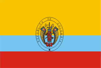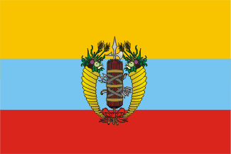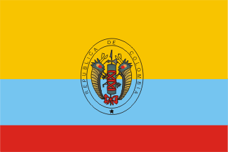 España, debido a la revolución liberal de Riego cuando las tropas salian para America (1820) hubo de reconocer a este estado (Noviembre de 1820) pero las hostilidades se reanudaron al rebelarse los patriotas en Maracibo y con la llegada del español General La Torre en sustitución de Morillo. La victoria de Bolivar en la segunda batalla de Carabobo (24 de Junio de 1821) selló la suerte de la nueva Republica y acabo con la dominación española. Los españoles se refugiaron en Puerto Cabello hasta que en 1823 también esta fortaliza fue tomada. El 30 de Agosto de 1821 la Constitución de la Republica de Colombia establecia la bandera del estado. Restrepo Uribe indica que en esta epoca se seguía usando el celeste como color citando a Ruiz Gutierrez, Wise y Rosignol y Bohorquez. Un acta oficial venezolana fechada el 8 de Julio de 1811 establecía los colores venezolanos como azulceleste, amarillo y encarnado. En cambio opina Restrepo que no era la bandera de tres franjas iguales y cita otro documento oficial venezolano de 1876 pero relativo a hechos del 5 de Julio de 1811 en el cual se establecia la bandera con tres franjas horizontales: amarillo mas ancho, azul menos ancho y encarnado, menos ancho que el inmediato. También menciona el documento que el 14 de Julio se proclamo la independencia y se enarbolo el pabellon nacional adornado con el emblema de una india. Este emblema es probablemente el mismo que figura en el escudo nacional que aparece al mismo tiempo (1811) y que Restrepo Uribe muestra en Banderas nmº 30 de donde se ha escaneado la imagen.