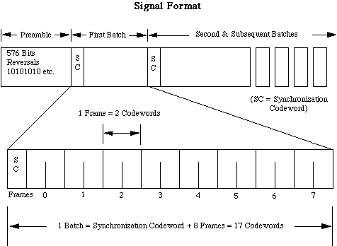 The POCSAG code format consists of a preamble and one or more batches of codewords. Each batch comprises a 32-bit frame synchronization code and eight 64-bit address frames of two 32-bit addresses or idle codewords each. The frame synchronization code m
