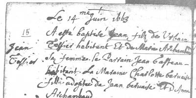 ![]() Baptistm of Jean Tessier son of Urbain June 14, 1663, Montreal |