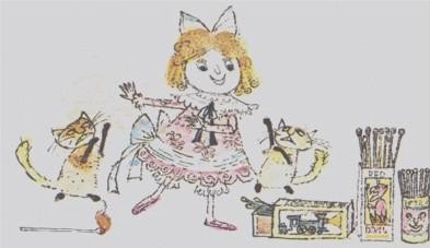 But Minz and Maunz, those clever cats, Lifted their paws and told her, "That's Not like a toy. 'Twill scratch and spit-- Your father has forbidden it. Pauline, put down those matches now, Or you'll be hurt. Miaow! Miaow!"