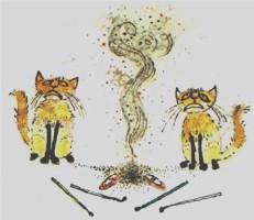 But Minz and Maunz, those clever cats, Lifted their paws and told her, "That's A foolish way for you to act. You'll get in trouble. That's a fact. There's one thing everyone has learned: You play with fire, and you'll get burned. Put out that flame and do it now. Miaow! Miaow! Miaow! Miaow!