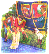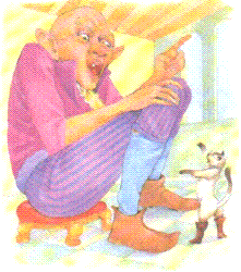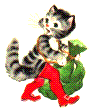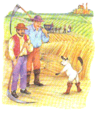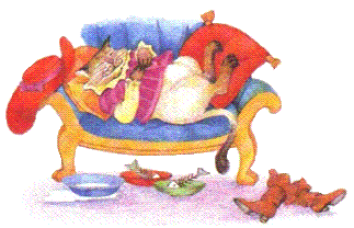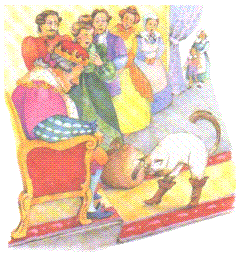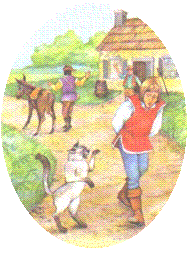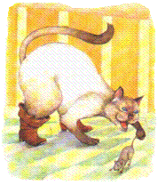 Long ago there lived a miller and his three sons. When the miller died he left the mill to the eldest son, his donkey to the second son, "Alas," said the boy. "I could sell the cat's skin for a penny or make me a cap of it. But what else is a cat good for? I'll starve surely." As the youngest son sat thus bemoaning his fate, the cat heard him. Going up to his woeful young master he said, "Good master, do not be downhearted. If you will but get me a pair of boots and a large bag with a drawstring, I shall make your living for you." Then he hastened to the royal palace and asked to see the King. When he came before the ruler Puss bowed low and said, "Sire, I have here a fine hare which has been sent you by my lord the Marquis of Carabas." And Puss smiled behind his whiskers, thinking of the noble, high-sounding name he had made up for his master. The King thanked him, for the hare was indeed a fine one, and Puss in Boots departed. Next day Puss went out agin with his bag. This time he baited it with grain. Again he left it open and lay down to a pretended nap. Along came a fine fat partridge, who, seeing the grain in the open bag, went in after it. At once sly Puss in Boots drew the string tight and the partridge was caught. As before, Puss in Boots went to the palace and politely asked to see the King. When he has been admitted to the King's presence he said, "Sire, here is a gift from the Marquis of Carabas. He has many of these fine rare birds upon his land." The King was pleased with the thoughtfulness of this unknown Marquis of Carabas, and did not let on that he had never heard the name before. Of course, no one else had ever heard of it either, since Puss had made it up. But no one in the King's court wanted to admit his ignorance, and so no one ever asked who the Marquis of Carabas was. For some time Puss in Boots continued to bring gifts to the King, until that vain personage began to think the Marquis of Carabas must be a rich young man indeed. One day Puss heard that the King and his lovely daughter were going for a drive along the river. Hastening to his young master he said, "Good master, if you will follow my directions, I think your fortune is made." Then he told the miller's son everything he had done, adding that the youth must go to bathe in the river at the exact time and the exact spot Puss in Boots should tell him. The young man did as he was told, although he didn't see the sense of it. As he was swimming about in the water the cat took his shabby clothes and hid them under a rock. When he heard the rumble of the King's carriage, Puss ran to the road crying, "Help! Help! The Marquis of Carabas is drowning!" Recognizing Puss, the King stopped the carrige and ordered his servant to go and pull the Marquis out. Puss ran up to the carriage and said, "Oh, Sire, I don't know what to do. While he was swimming, my master's fine clothes were stolen." The King sent his servant to the palace at once with orders to fetch clothes suitable for a rich nobleman. When the miller's son had donned the silken clothing, which was better than he had ever seen before, he looked so handsome that the Princess fell in love with him at sight. She begged her father to take the young man into the carriage with them. Puss in Boots ran joyfully ahead of the carriage and was soon out of sight. When he saw some reapers in a grain field, he ran up to them and cried, "The royal coach is coming this way. Not wanting to be ground into micemeat, the reapers agreed. When the King approached he called out, "Who owns these fine fields?" The reapers answered, "The Marquis of Carabas, Sire!" Puss ran on till he came to some men who were mowing the hay in the meadow. He ran up to them and cried, "The Royal coach is coming this way. When the King asks you who owns these fields, see that you answer, 'The Marquis of Carabas.' If you refuse you will be ground into mincemeat." These people, too, obeyed the cat. So again the King was told that the land belonged to the Marquis of Carabas. Next Puss came to a great castle in the wood. He knew it to be the castle of a terrible ogre who had the magic power to change himself into many other shapes. Going to the door he said, "I have a message for the owner of this castle." When he was led into the presence of the ogre, Puss said, "I have heard so much about you that I had to pay you a visit. I cannot believe that the things I hear are true. Surely you cannot change yourself into a lion!" "Oho, can't I?" said the ogre, greatly flattered. And he promptly changed himself into a lion to provethat he could do it. At the sight of the lion Puss ran up the curtain in fright. There he clung until the ogre was himself again. Then he came down and said, "Marvelous! Simply marvelous! You became a huge lion in a twinkling. But can you become something small? Surely it is not true that you can change into a mouse!" "Oho, can't I?" roared the ogre, and in an instant he had became a timid little mouse. Faster than lightning Puss pounced upon the mouse and ate him up. Then, running to the door, he saw the royal coach approaching. Holding the door wide, he called out, "Welcome to the castle of Marquis of Carabas!" When the King saw the rich palace the Marquis owned, and had walked through the spacious grounds, he made no objection to his daughter's marrying the young man, which she did at once. And that is how the famous Puss in Boots made his master's fortune. background made by Adrianne - if you wish to take this, all i ask is that you link back ... thanks