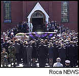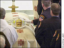 Ganci, a 33-year veteran of the department, died fighting the fires in the famed twin towers after two hijacked airliners plowed into the structures. His white chief's helmet lay on his casket during the service in Farmingdale, on Long Island.