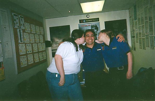 Ok, long story on this one. Me and Lucia and Alec were all in the break room at General Cinema's Fenway Theater (Where I used to work) and our co-worker Ivelisse walked in with a camera, and wanted a picture of us. Me and Lucia decided to be cute and kiss Alec on the cheeks when the pic was taken. The timing was slightly off, but oh well. Alec is a GOD. **SIGH**