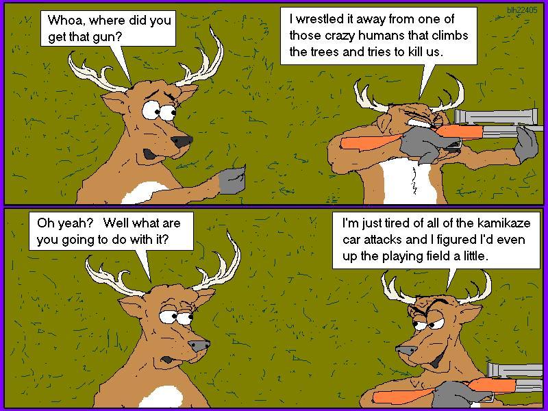 All I can say is, you better be glad that deer don't have hands, aiming capabilities, or the "killer instinct" that other animals seem to have. This would certainly make you second guess every hunting accident you've ever heard about. I do think that they purposely target moving automobiles. I've had not one, but two deer run into my automobile in the past. So I say kill them, eat them, and long live Ted Nugent.