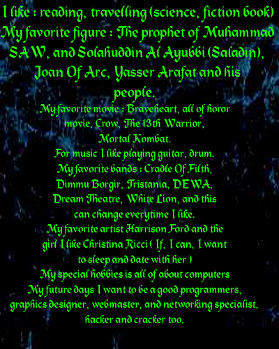 Home | Biography | Favorites | Photo | Wallpaper | Contact | Links | MP3 | Sign Guestbook | View Guestbook WebLord by Alpha Rossiandy H ( Alpha Tech )