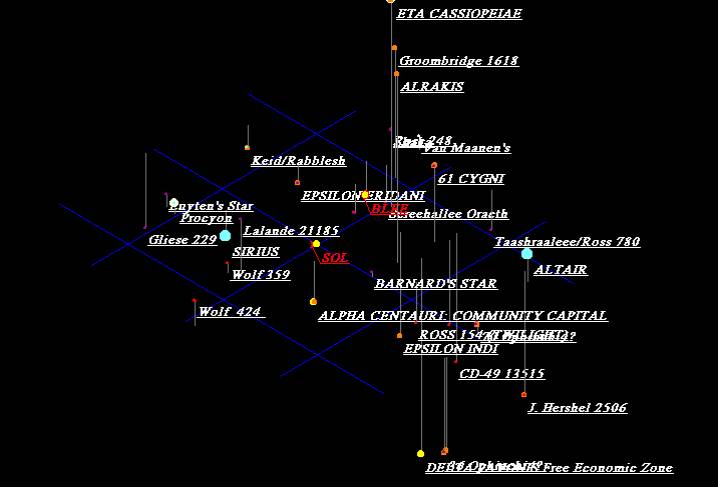these are the important systems out to 20 light years from Sol. Aside from the Blee Homesystem all these systems were colonised in the Relativistic Age are very old and established and horrendously expensive to stay in