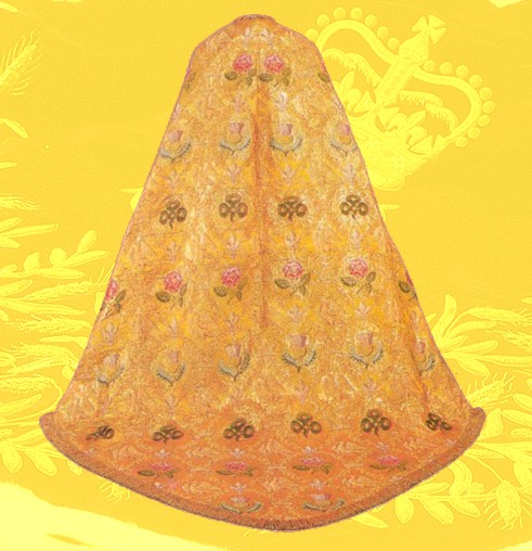 This superb robe in cloth of gold is one of the clothes with which the Queen was invested during the Coronation ceremony. It is called the Imperial Mantle or Pallium Regale and is matched by the Stole Royal. It is said that the materials of which this magnificent garment is made may be descended from the Imperial Robes of the Byzantine Emperors. In this form it dates from 1821, and the designs are the Rose, the Thistle and the Shamrock.