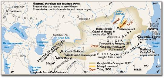 The above map is taken from http://www.nationalgeographic.com/genghis/khanmap.html and is copyrighted by National Geographic Society (1997), all rights reserved.