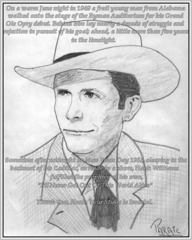 "Your Cheatin' Heart" "You Win Again" "Cold Cold Heart" "I Can't Help It" "Hey Good Lookin'" "Honkeytonk Blues" "I'm So Lonesome I Could Cry" "Jambalaya" "I'll Never Get Out Of This World Alive" View My Guestbook Sign My Guestbook ~Enjoy~ Page designed by Gramps--Sept., 2002 Please Visit Gramps' Place* Chillin With Gramps* Keeper of the Stars* Last Date* Time Slips Away* Look At Us*