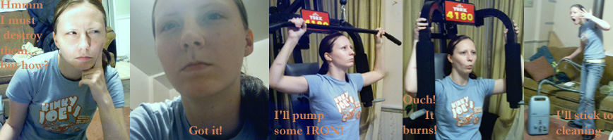 [ Thu Jul 03, 06:21:26 PM | Ginny Burrell | Somehow there was a mistake. A very huge mistake. The Brain had ordered Jessie inside of an air-tight transparent cube (located deep within her laboratory full of James Bond quality inventions) with a bottle of "NO HAIR." From her control panel, the Brain watched as Jessie applied the solution to her hairy hairy legs (whose hairyness in comparisson with certain unmentionables is disputable). She noticed then that there was a thin pink vapour rising from the solution that Jessie was applying to her legs. To her horror, the Brain saw that Jessie was in fact inhaling the noxious gas. Almost immediately Jessie began to laugh...and laugh...and laugh....though The Brain could not comprehend just what was so funny. The Brain immediately engaged the air conditioner within the box and the gas was sucked out. She then ran over to the cube and unlocked the door. Jessie, still giggling, exited her trap and began running around wildly shrieking about frogs, farts and foghorns. And laughing histerically. The Brain watched on with mild confusion as she witnessed the birth of The Insano!
