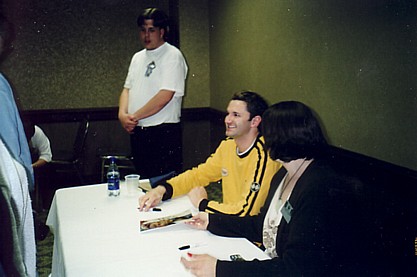 Sunday was pretty quiet. I think most people were suffering from a hang over. Basically, all we did was listen to Q&As and get our photo signed. Like I said, Andy's Q&A was something else. At the next con, it will be on my list of priorities. The guy can ramble for 20 minutes straight and start telling stories of his childhood, and still keep your attention cause he's just so damn cute and funny. And he lets slip all these details that he really shouldn't talk about and it just makes him so much funnier. Lorne was always the reason why I watch Angel, but now more than ever. When he was saying that he's friend with Alexis and that Alexis would call him saying things on his answering machine like: "Lorne? It's Wes. I'm calling to say.. I woke up this morning, and the water in the Jacuzzi is kinda green. Where you in there?" or better yet. When he told us how once, during the first year he was on Angel, they were all going to Hooters because they just loooove the chicken wings there (yeah right) He didn't want to go because he was wearing his make up. But he changed his mind. So people saw a green demon running down the street in his yellow outfit. It's not that funny the way I say it, but believe me, when HE was telling the story, people were screaming! C'mon, how could you not love a guy who bought a yellow school bus when he was 13years old? LOL