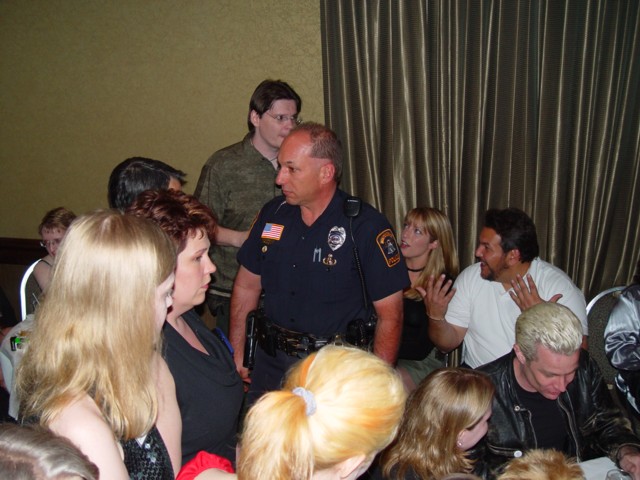 Saturday. The autograph session for James took a long time, but it was very well organized. Hey, I was at Shore leave... I know what chaos truly is. At least, we had assigned seats and they were calling people by row. So you could go outside, smoke a cigarette or have a drink or whatever, and come back to get your autograph. That was pretty cool. Half way through the signing, we heard that Andy arrived and was gonna start signing. We didn't hear it was only for the "Saturday only" people so Tammy and I went (we were row H for James, and he was only at row D so we had time to kill). So we waited for an hour and when we get at the front of the line, we're told that since we have a two-day pass, we can't get an autograph today. So I gave the guy my "puppy eyes" and he caved in. Hehehe, evil me! Andy really did look tired. I believed him when Sunday he said that he didn't sleep for over 72hours. He came on stage with a Redbull in his hand ;-) Then we got our stuff signed by James (who was delightful as usual) and went to our rooms to change for the banquet.