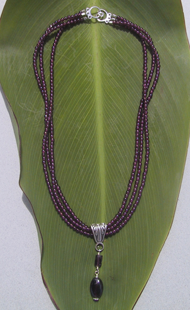3 Strand Garnet Necklace Click here to see price or purchase This very elegant necklace has 3 strands of solid round garnet beads and a pendant made of a fancy silver slide bail,an oval garnet measuring 1/2" long and a faceted rectangle garnet. Both are wire wrapped with sterling silver, clasp is also sterling silver. The whole pendant including the bail measures 2" long. Necklace measures approx 15".