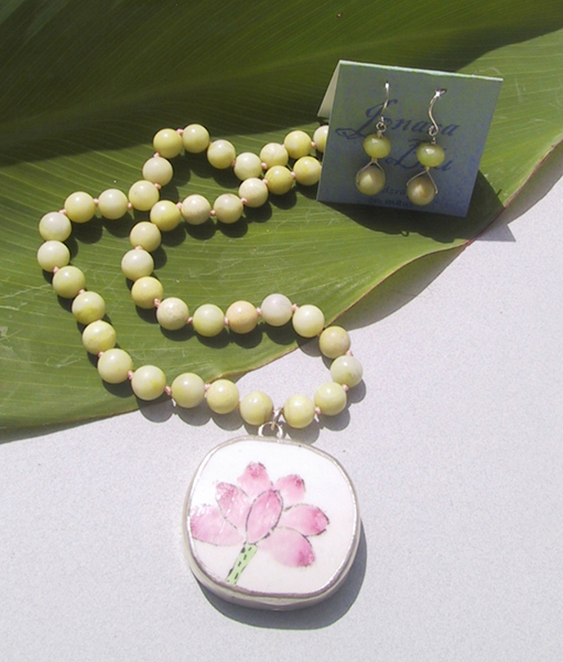 dynasty pottery pendant with olivestone beads. Hand knotted on