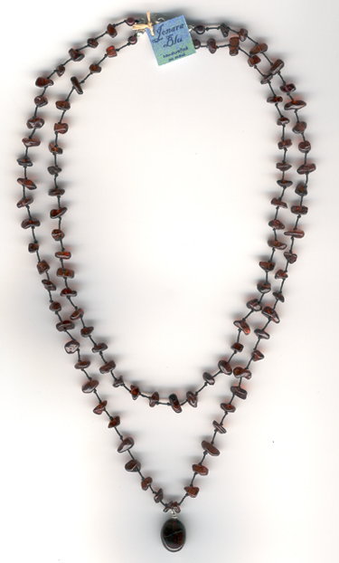 Oval Garnet pendant on a double strand of garnet chips hand knotted on black cord.