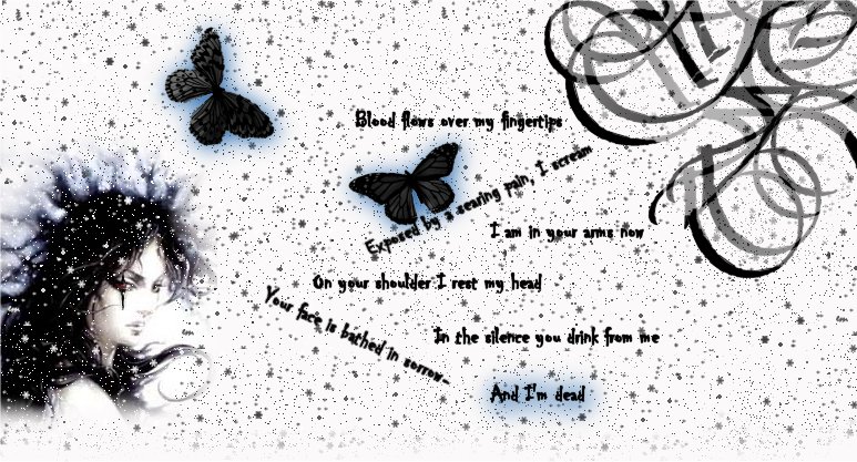 I am a great lover of many things, including Anne Rice's Vampire Chronicles, Music (Savage Garden, Disturbed, Evanescence, Richard Marx, Darren Hayes, Guns N' Roses, the list goes on and on), writing romance stories, poetry, Art and the supernatural (cause to me, it's just normal and natural).