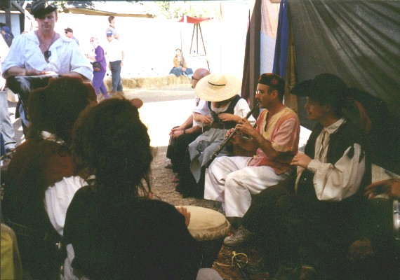 This is a picture taken at the drum shop at the Faire. This is the site of numerous spontaneous drum circle jams throughout the course of the Faire. The guy in the feathered hat is my friend and usual faire-going partner, Russ.