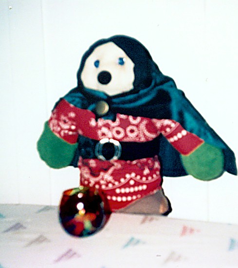 This little guy was the first doll I made. Somehow I inherited my great grandfather's sewing machine and I decided to try to use it. Since I had no idea how to make clothes (and still don't) I used scraps of material that happened to be lying around the house and cobbled together this little bear. I know, it's not a very good picture, but I gave it away to a friend for her birthday and I'm afraid this is the best picture I have of him.