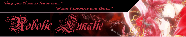 About Robotic Lunatic Robotic Lunatic is a story I started about two years ago. It's been through its share of hiadases (one stretching to about six months when I killed my monitor trying to upload the Harry Potter PC game), but it's my baby and it's the one story I'm most dedicated to. :) My personal favorite characters are Kheyman Maharet and Urara von Alucard.Well, read on and I hope you enjoy it as much as I do! I currently have 8 chapters up and I'm working my butt off on the 9th. This page is best viewed with 800x600 screen revolution. Higher is okay, but lower will screw it up. Special Notes To read the chapters, you may have to increase the text view size on your server. The text is shamefully small, but the chapters would take up too much room if they were any bigger. Gomen. :(Please do not steal any chapter or any information regarding or containing anything having to do with Robotic Lunatic without my written consent. Robotic Lunatic is my property and my original work, and I will be immeasurably, not to say deathly, infuriated at anyone who dares to take any of my work and claim it as their own. That is plagarism and I and the court of law will not stand for it! But if you are a free-lance writing site interested in displaying my story, then you are most welcome to e-mail me with your request and a link to your site. I will then check over your site and reply to you within 24-48 hours (I'm pretty good at responding quickly) whether I will let you or not. Thank you! Li'l Helpers ![]()