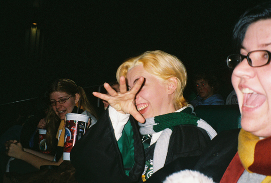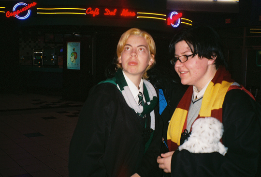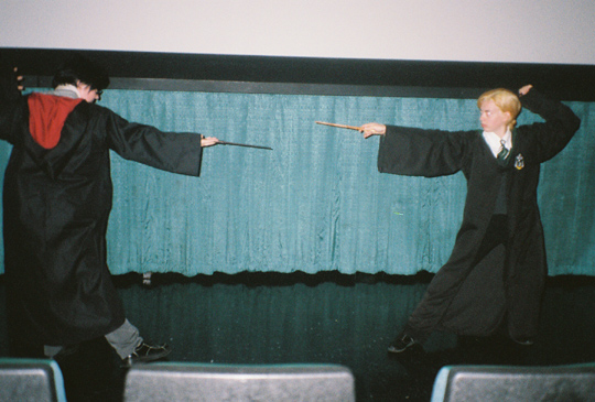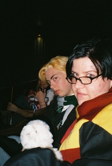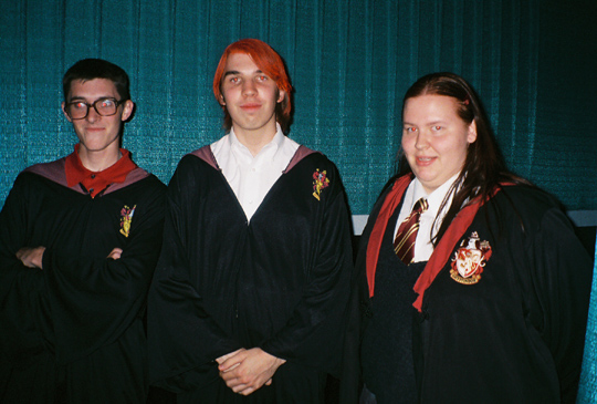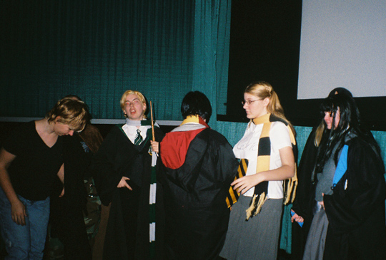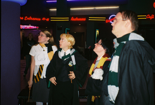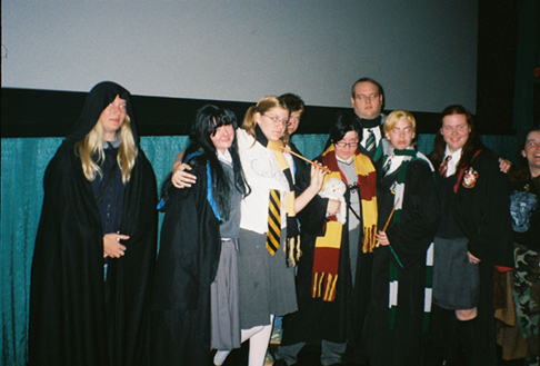 Recently in Oklahoma city, there was the first sneak release of the new Harry Potter Movie called: " Harry Potter and the Goblet of Fire" at 12 midnight. My daughter Amber and her band of true Harry Potter fan friends went to see it and got an unexpected warm welcome by everyone that were waiting inside the theatre. People wanted their pictures of them in costume and wanted them to also put on a play about Harry Potter. They agreed to do it in front of the stage and the rest was magic! You see, they were the only one's there that appeared in full costumes of the main characters. Some of the costumes and all the capes were made by Amber.