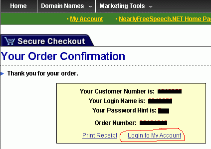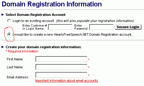 Make sure the "I would like to create a new NearlyFreeSpeech.NET Domain Registration account" is checked. The top one is for those who already have an account here. Enter the Required information below; name, e-mail address, etc. Click "Continue". Keep going.