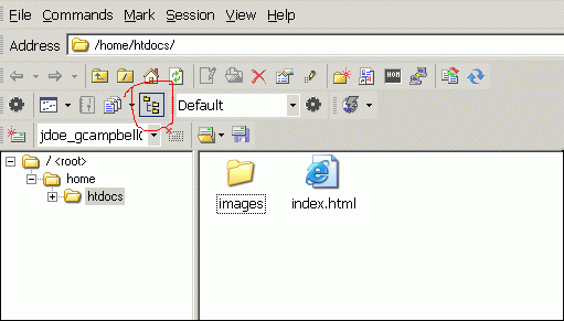 To get rid of the directory tree on the left (Why not? It takes up space and isn't really needed) click on the icon that's circled here. The directory tree will go away, leaving you with a full screen to drag and drop onto. Now you can open the folder where your website is stored in and set it and the WinSCP screen side by side where you can easily drag and drop files and folders.