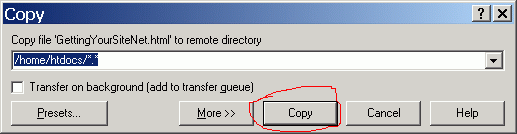 When you drag and drop, the screen below always comes up before it will start transfering data. Select "Copy". Also, when using these types of programs, the destination directory is supposed to say /home/htdocs/. Do not change it to /home/, thinking that this is the root directory that you should be working in.