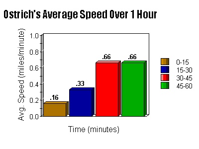 The first graph we will show you is an average speed versus distance bar graph of the ostrich's run. Each bar on the graph represents a time interval. The key to which bar is which is on the right hand side of the graph. This graph is used to show the varying average speeds of the ostrich throughout the run. This graph coordinates with the first of the average speed tables on the speed page. Look below for the graph.