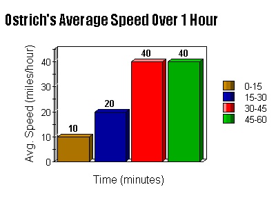 Different, isn't it? The graph above shows that the ostrich speeds up from 10 miles per hour in the first fifteen minutes to 40 miles per hour (the maximum speed of an ostrich) for the final half hour. There is just one problem to these bar graphs, however. These particular graphs fail to give a helpful visualization of the acceleration of the ostrich during the run. There is only one graph that will accomplish what we need...A LINE GRAPH!