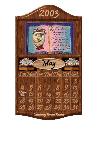 I have very much been lagging here lol. Simply because I have spent a lot of time in PSP groups. I will slowly keep up lol. I have added the May Calendar...bit late I know hehe. Also I have removed the link to my recipes page until I have filled it up with more recipes. My Adoptions page has gone due to reformatting my puter so I have to redo that again.